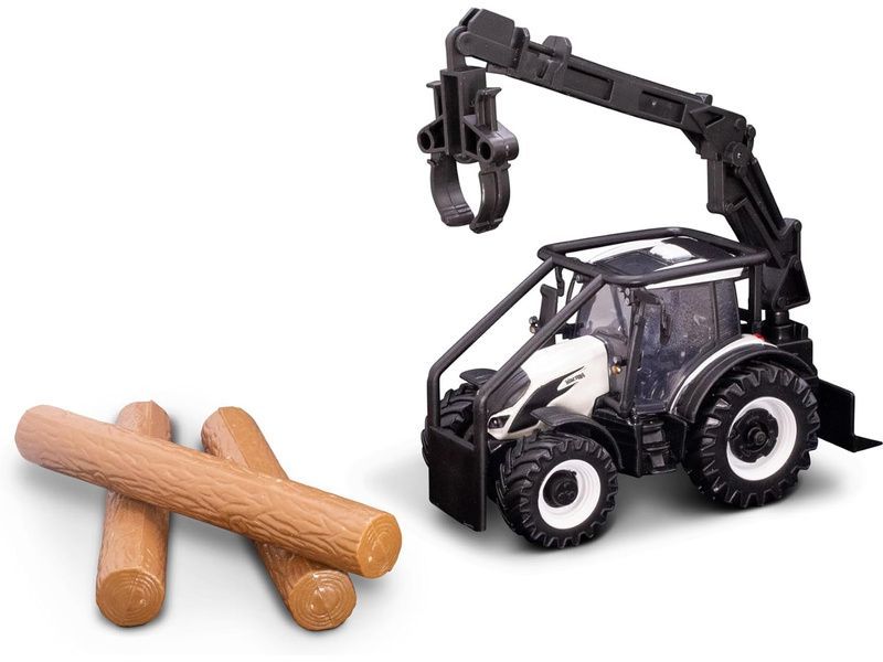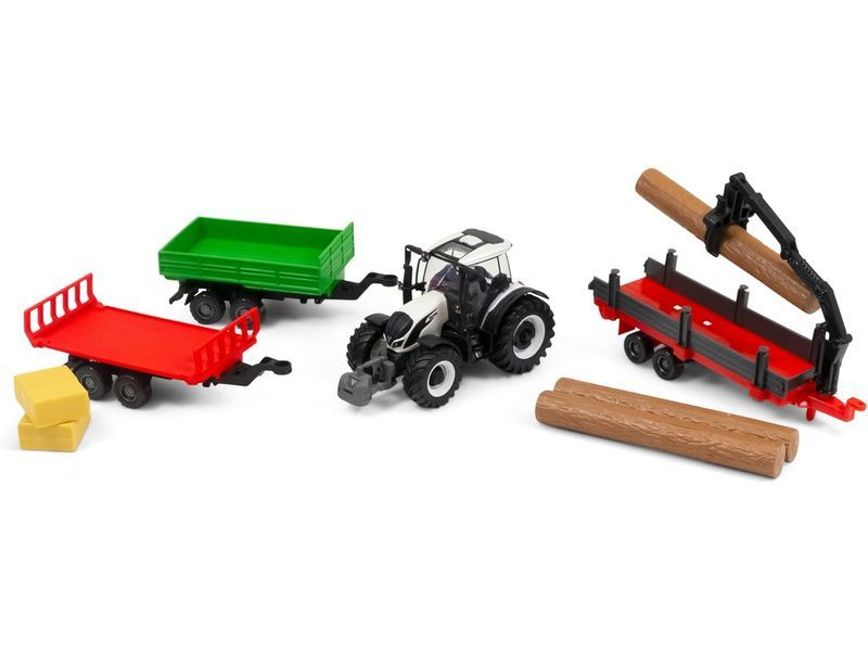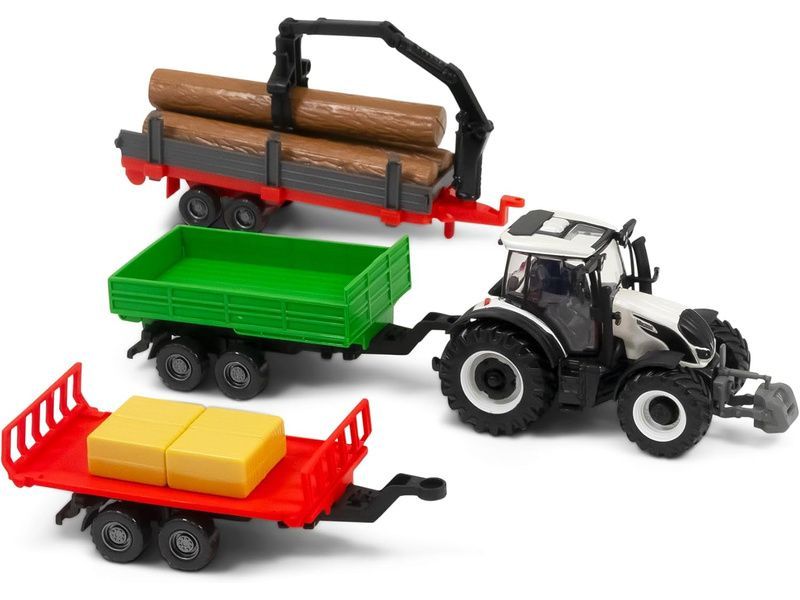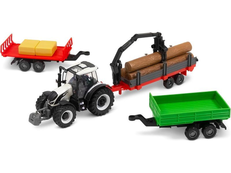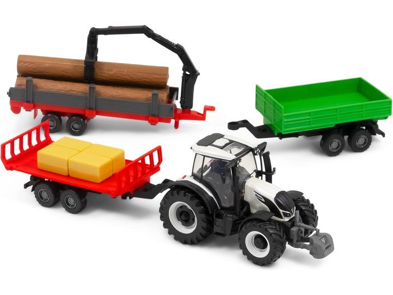 Model zemědělského traktoru Bburago - Valtra N174 s doplňky. Je vyroben z plastových dílů. Model má pryžové kolečka na setrvačník, odjímatelnou kabinu. Traktor s přívěsem je přibližně 26 cm velký.