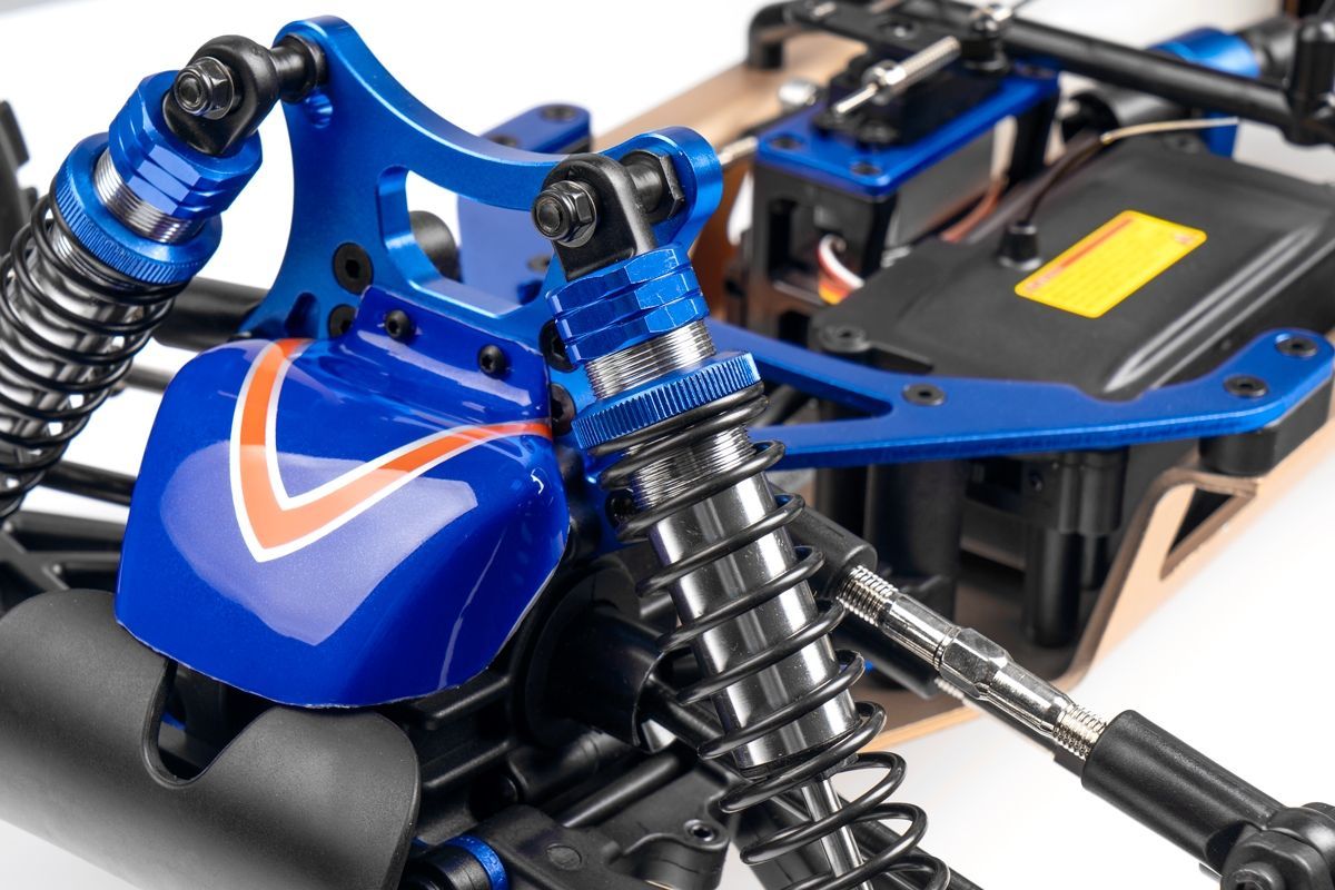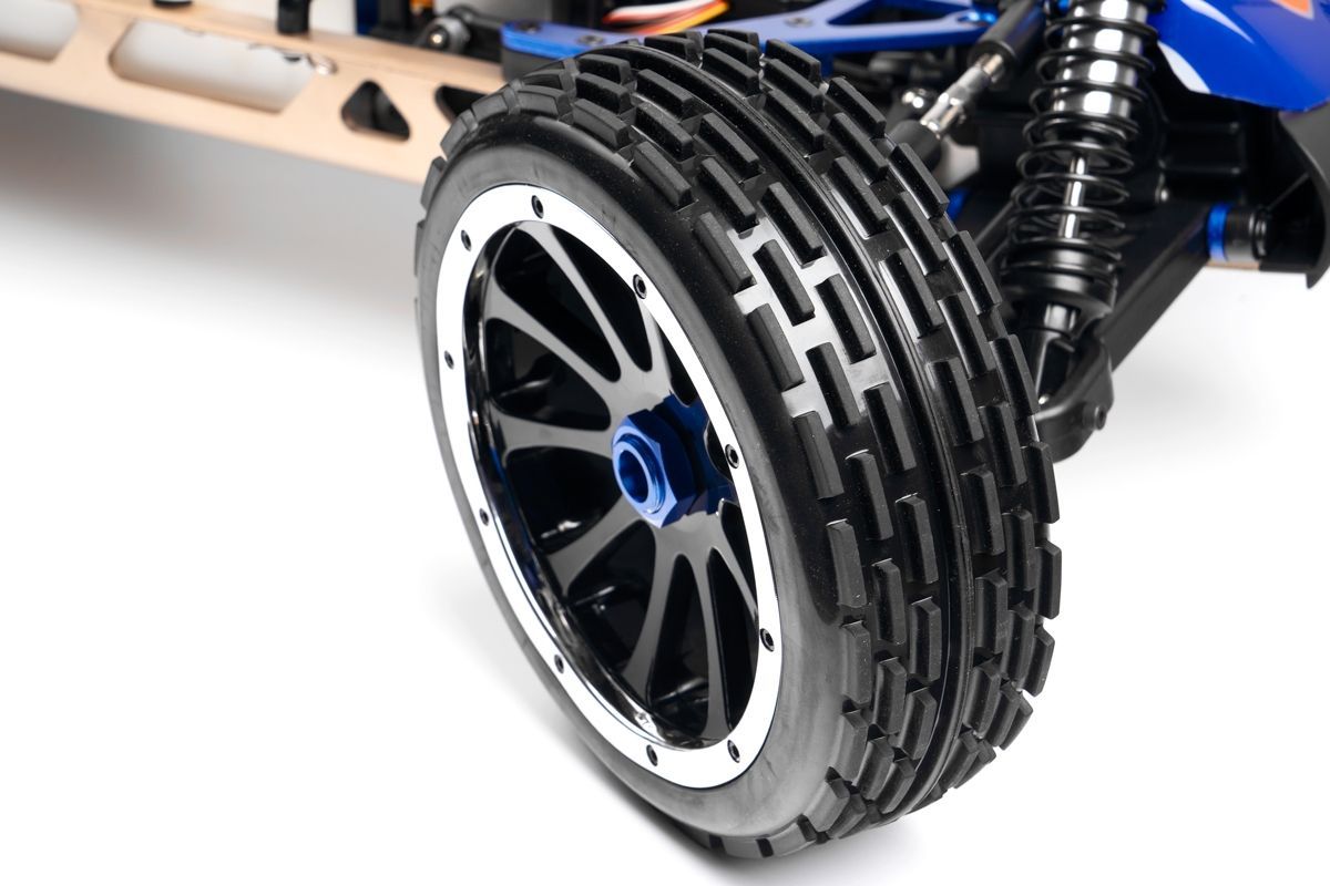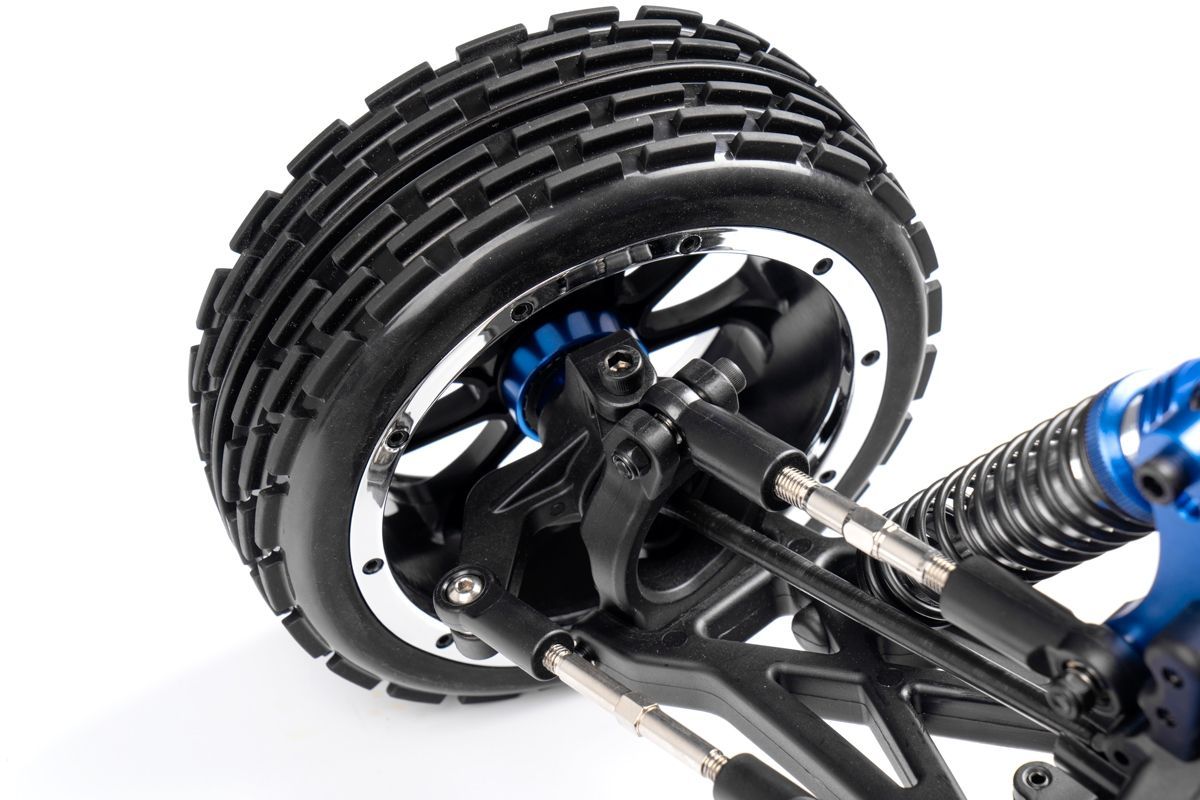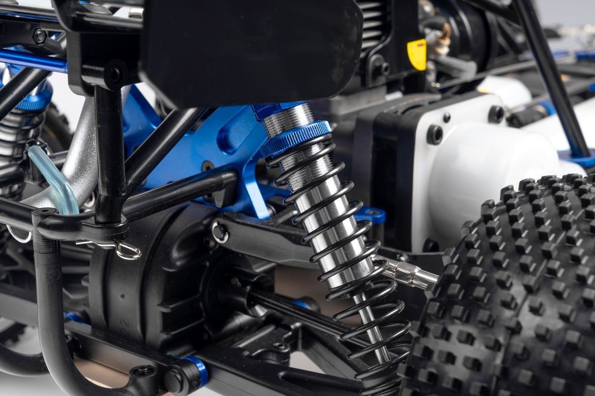 Veškeré spojovací tyče (svorníky ramen apod.) jsou ocelové o průměru 7mm vybavené pravo-levým závitem a šestihranem, což umožňuje pohodlné a přesné nastavení geometrie podvozku. O odpružení se stará čtveřice celokovových olejových tlumičů s vinutými pružinami. Předpětí pružiny je jednoduše nastavitelné pomocí matice s jemným závitem. Modře eloxované držáky tlumičů (parohy) jsou vyrobeny z 8mm silného!!! duralu. Ráfky kol jsou vybaveny šroubovaným límcem, který zajišťuje pneumatiku bez nutnosti lepení. Nízkoprofilové pneumatiky mají osvědčený "buggynový" vzorek a mají průměr 178mm. Bezpečně zastavit tento model to už chce sílu a proto je použita dvojitá kotoučová brzda.
