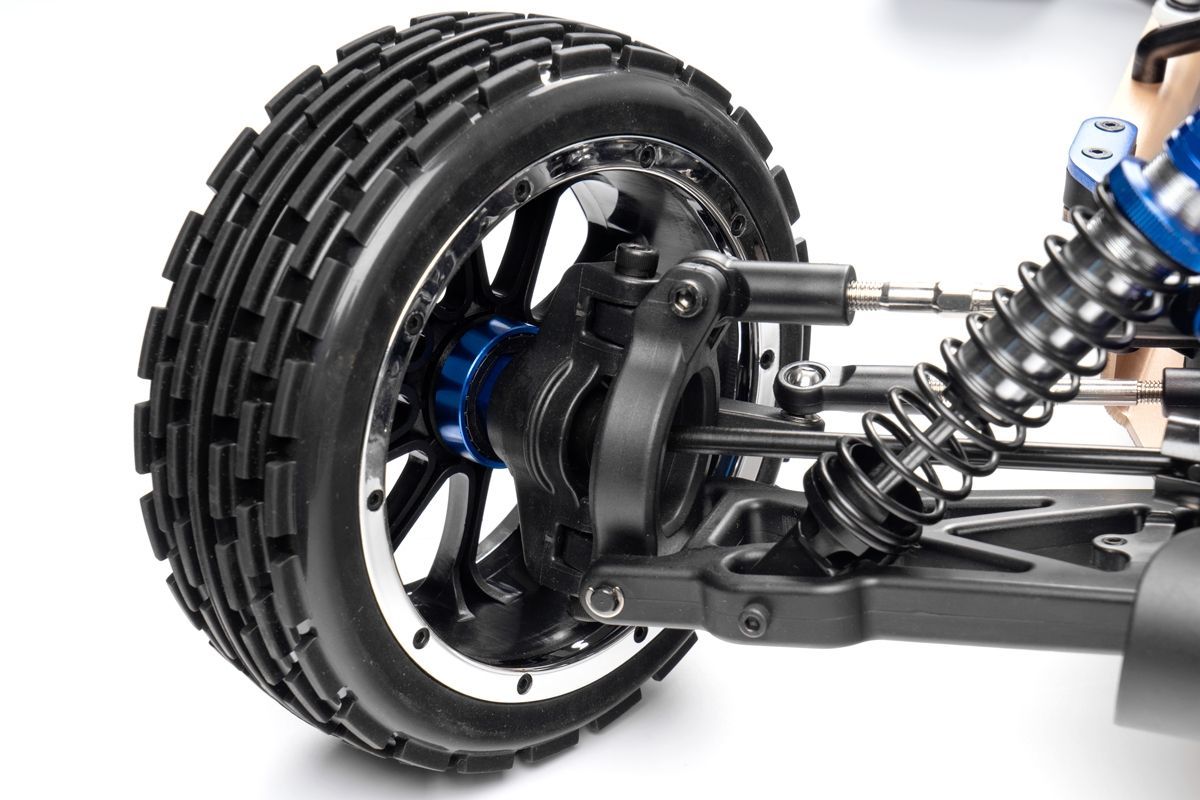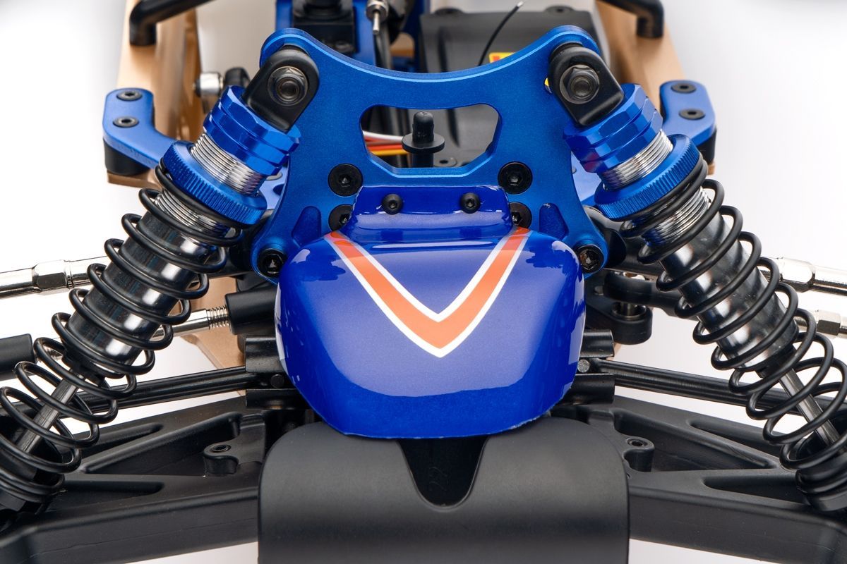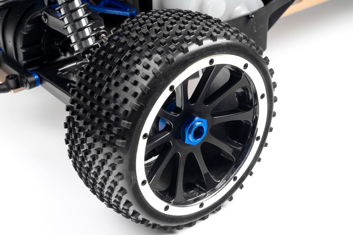 Veškeré spojovací tyče (svorníky ramen apod.) jsou ocelové o průměru 7mm vybavené pravo-levým závitem a šestihranem, což umožňuje pohodlné a přesné nastavení geometrie podvozku. O odpružení se stará čtveřice celokovových olejových tlumičů s vinutými pružinami. Předpětí pružiny je jednoduše nastavitelné pomocí matice s jemným závitem. Modře eloxované držáky tlumičů (parohy) jsou vyrobeny z 8mm silného!!! duralu. Ráfky kol jsou vybaveny šroubovaným límcem, který zajišťuje pneumatiku bez nutnosti lepení. Nízkoprofilové pneumatiky mají osvědčený "buggynový" vzorek a mají průměr 178mm. Bezpečně zastavit tento model to už chce sílu a proto je použita dvojitá kotoučová brzda.