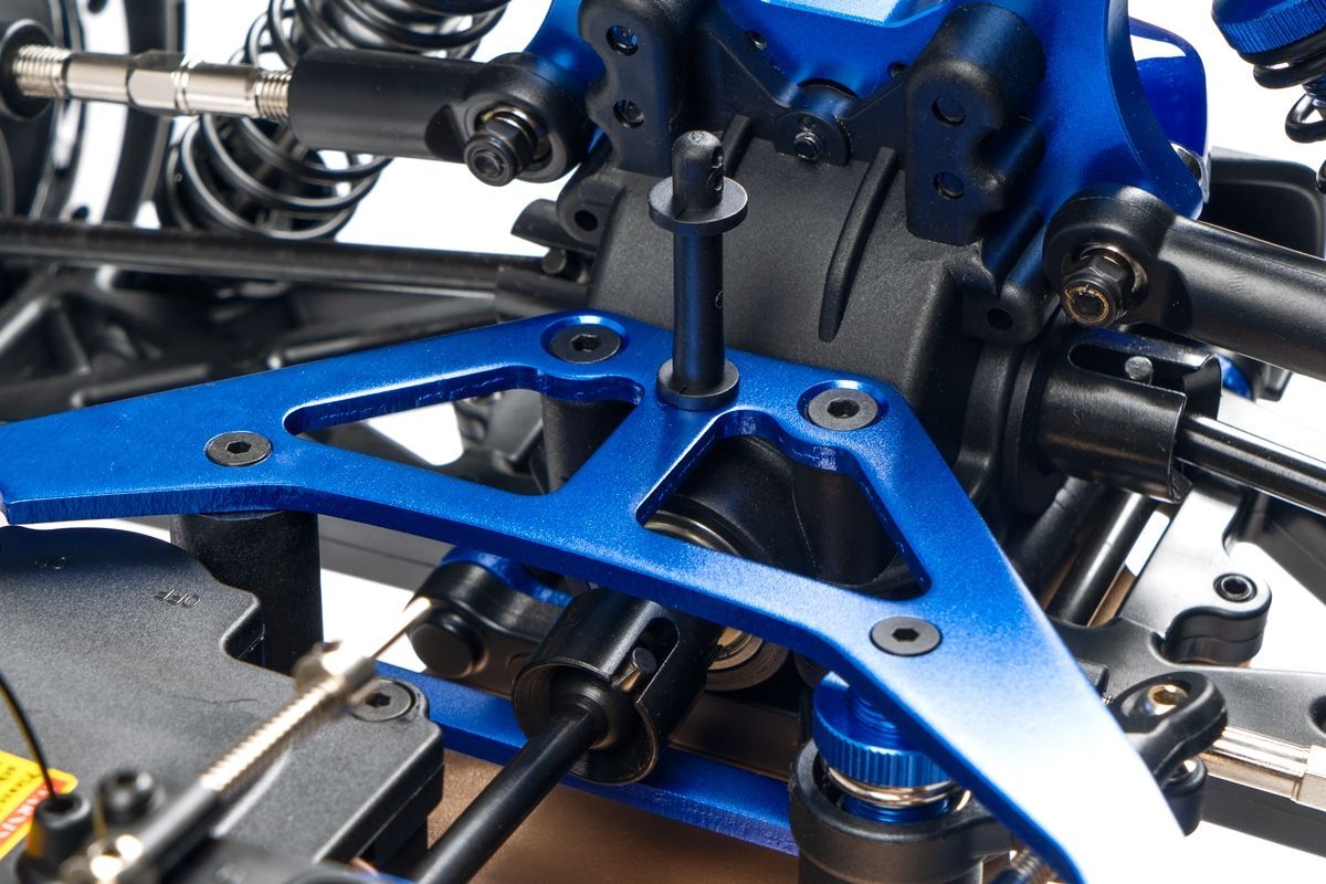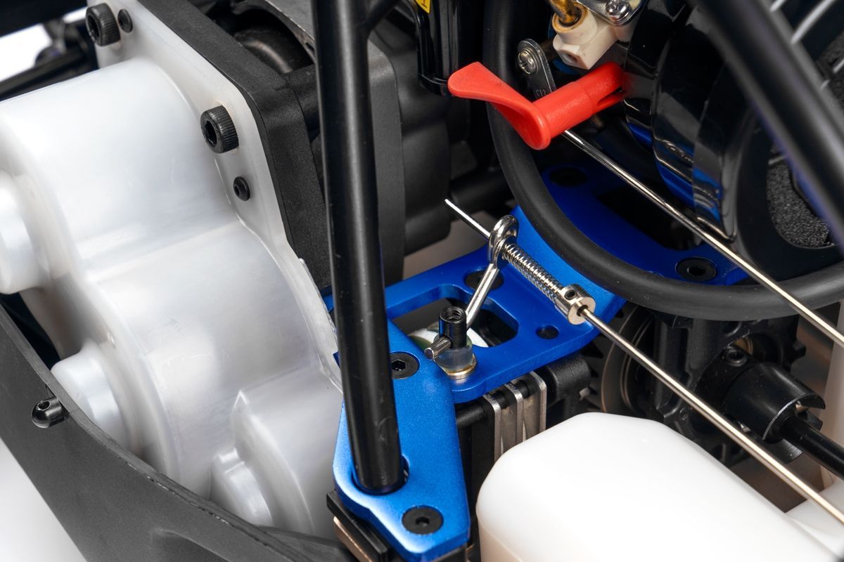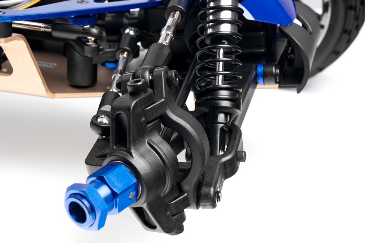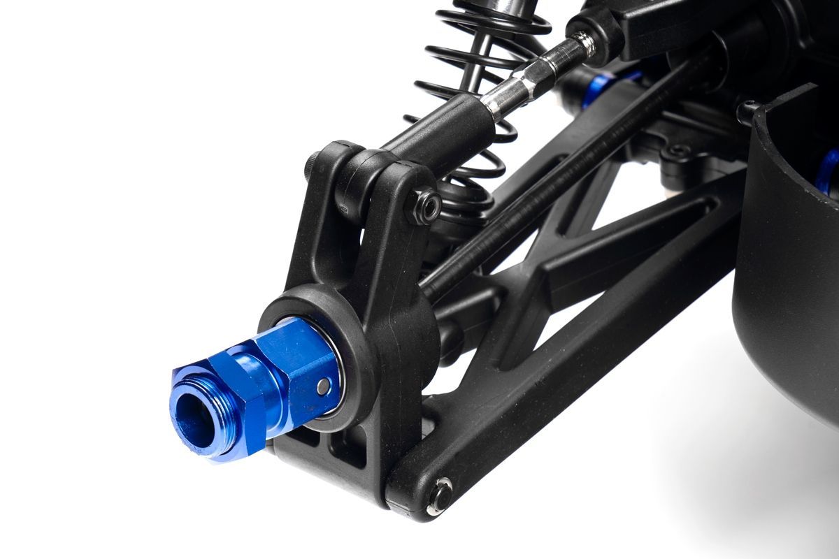 Veškeré spojovací tyče (svorníky ramen apod.) jsou ocelové o průměru 7mm vybavené pravo-levým závitem a šestihranem, což umožňuje pohodlné a přesné nastavení geometrie podvozku. O odpružení se stará čtveřice celokovových olejových tlumičů s vinutými pružinami. Předpětí pružiny je jednoduše nastavitelné pomocí matice s jemným závitem. Modře eloxované držáky tlumičů (parohy) jsou vyrobeny z 8mm silného!!! duralu. Ráfky kol jsou vybaveny šroubovaným límcem, který zajišťuje pneumatiku bez nutnosti lepení. Nízkoprofilové pneumatiky mají osvědčený "buggynový" vzorek a mají průměr 178mm. Bezpečně zastavit tento model to už chce sílu a proto je použita dvojitá kotoučová brzda.