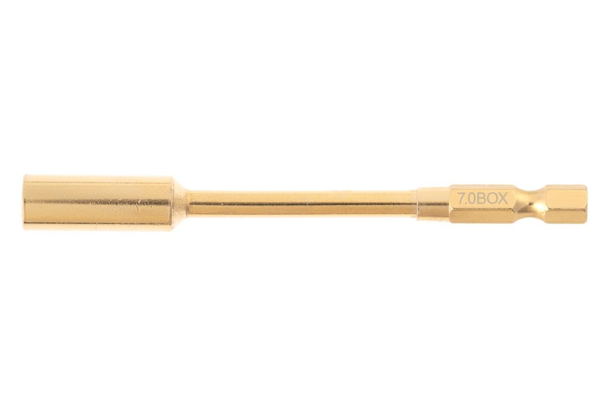 7,0mm nástrčkový bit s 6,35mm šestihranným adaptérem pro elektrické šroubováky, vyrobený z tvrdé oceli s titanovou povrchovou úpravou.