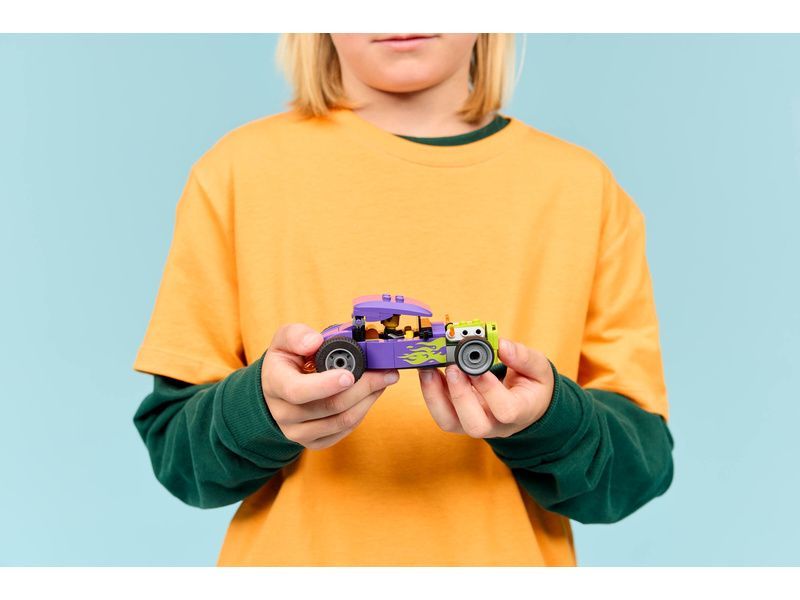 - KLASICKÁ STAVEBNICE AUTÍČKA Obsahuje vše, co děti potřebují k sestavení klasického autíčka Hot rod s obrovskými zadními pneumatikami a výrazným fialovým barevným provedením s neonově zelenými plameny