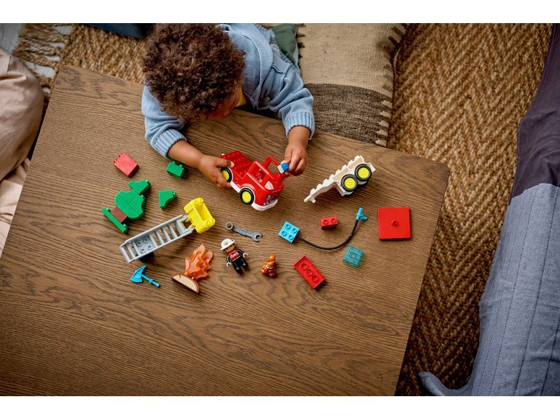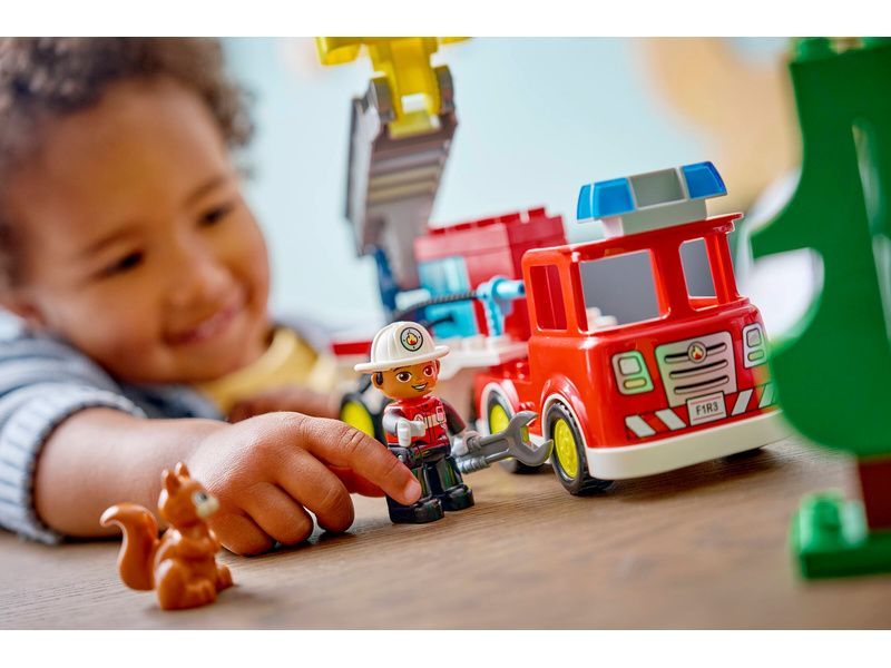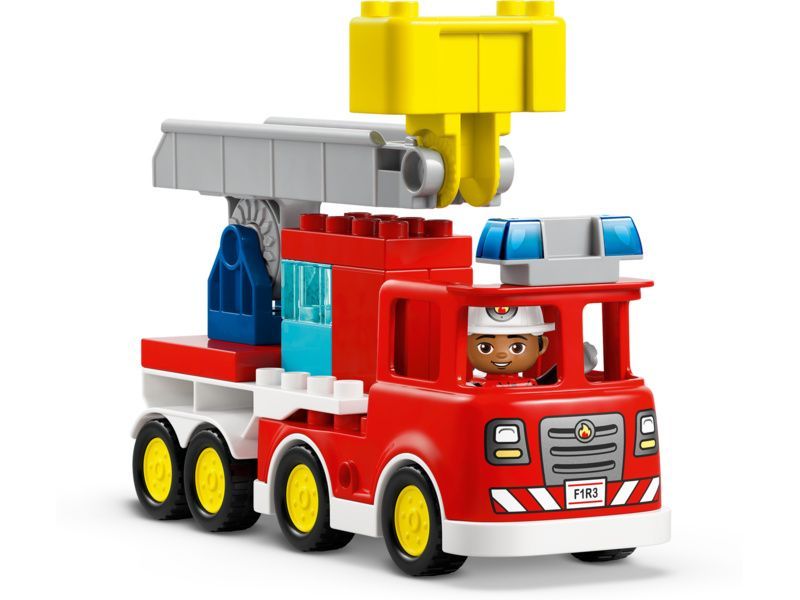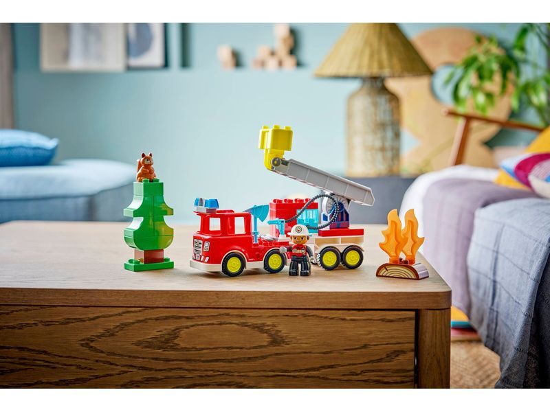 Model hasičského vozu LEGO DUPLO je nabitý zábavnými funkcemi, které děti inspirují k vyprávění kreativních příběhů o hasičích. Má sklápěcí žebřík a průhlednou nádrž na vodu z kostek LEGO DUPLO. Začínající hasiči k autu připojí hadici a uhasí oheň. Batolata si procvičí jemné motorické dovednosti při úpravě hasičského auta tak, aby mělo kloubový přívěs, který usnadňuje jízdu v zatáčkách. Stavebnice obsahuje 28 dílků.