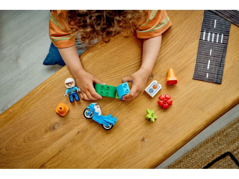 Děti posadí policistku LEGO DUPLO na motorku a procvičí své jemné motorické schopnosti při jízdě kolem kuželů. S hračkou v podobě semaforu můžou rodiče naučit malé účastníky silničního provozu, že červená znamená zastavit a zelená znamená start! Stavebnice obsahuje 11 dílků.