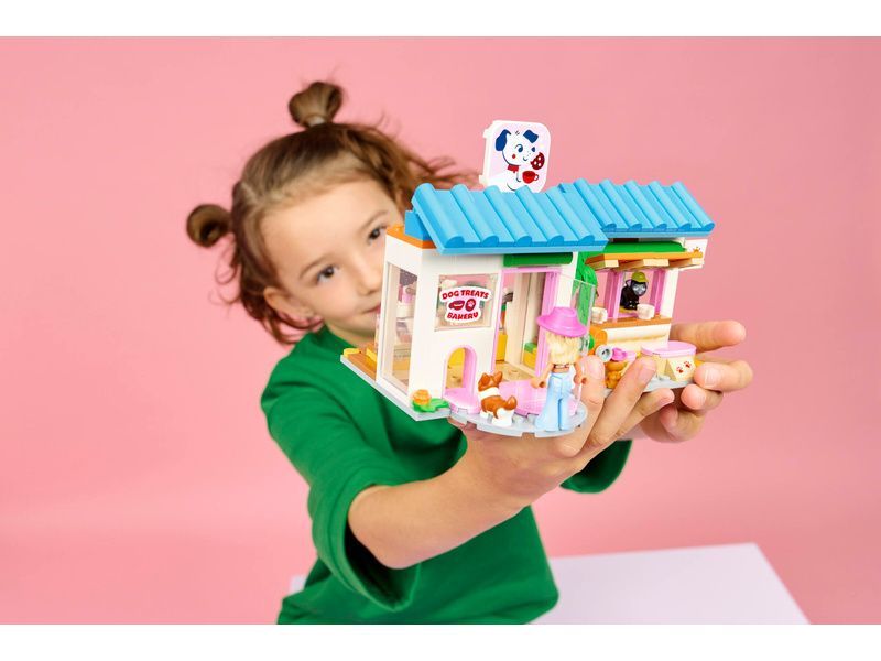 Tato stavebnice plná příběhů obsahuje 2 minipanenky, 4 hračky v podobě pejsků a spoustu doplňků pro domácí mazlíčky, se kterými si děti užijí hodiny zábavy. Součástí je také jídelní lístek, donuty, sušenky, pamlsky pro psy, kost, mléko, šálky a další.
