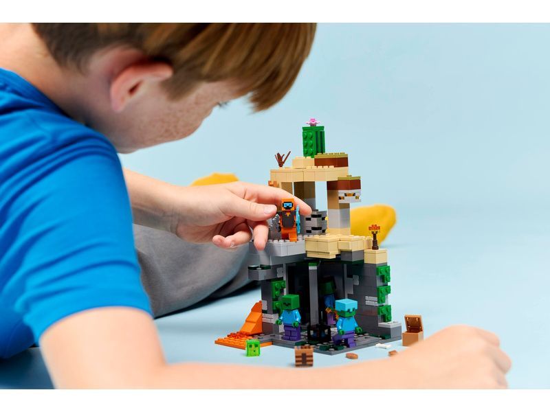 - HERNÍ STAVEBNICE Tato stavebnice z pouštního biomu Minecraftu obsahuje spoustu kreativních prvků, které podněcují fantazii, jako je otočná komora, z níž se vynořují zombie, a posuvný díl, který spouští sesuv kamení