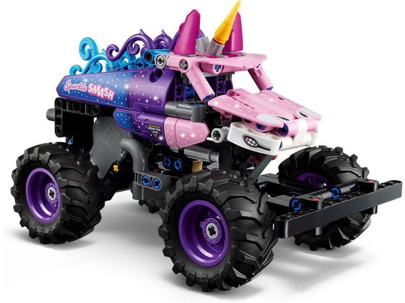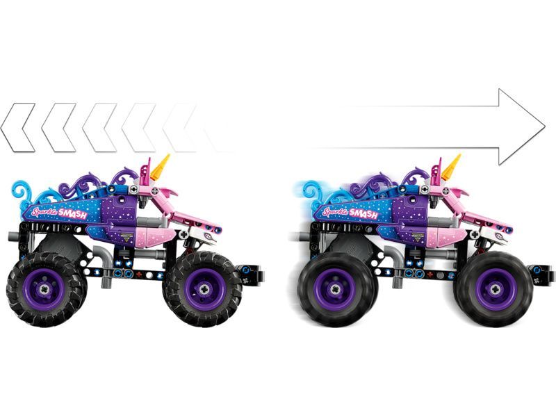 - STAVEBNICE MONSTER JAM Stavebnice LEGO® Technic Monster Jam Sparkle Smash s natahovacím motorem (42220) nabízí hodiny zábavy pro kluky a holky od 7 let, které milují monster trucky a hračky s jednorožci