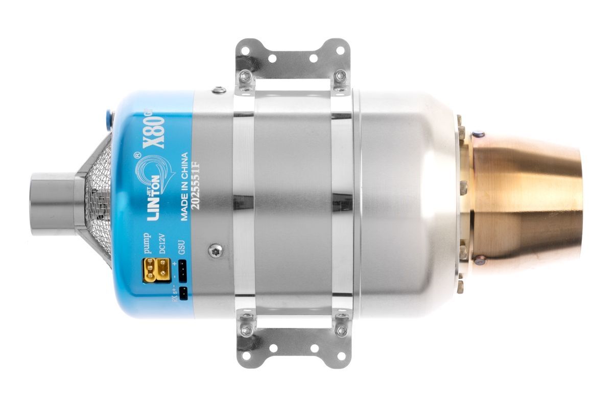 Sada motoru obsahuje: Proudový motor Linton X80-GT s řídící jednotkou, motorové lože, pozemní programovací jednotku, palivové čerpadlo, sadu upevňovacích šroubů, palivové potrubí, sadu kabelů a náhradních dílů, návod.