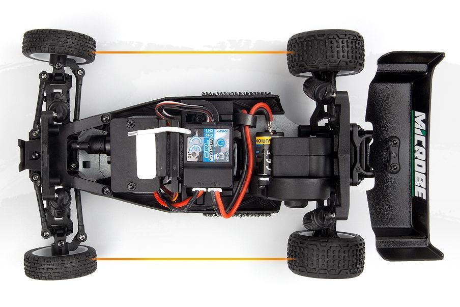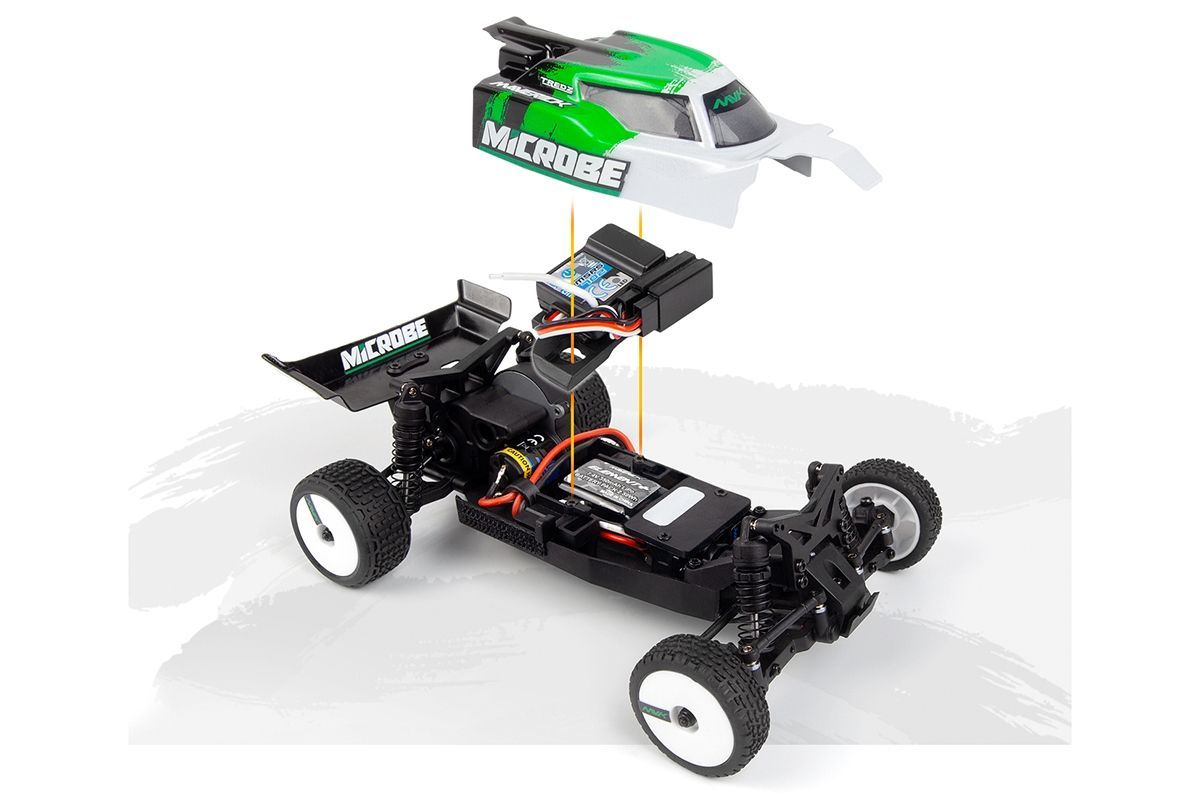 Elegantní 1,5 mm eloxované hliníkové plato podvozku, osazení kuličkovými ložisky a plynulá 3kolová zadní převodovka společně dodávají modelu Microbe stabilní a přesný pocit z jízdy. Přidejte olejové tlumiče a odvětrávaná kola s pěnovými vložkami a získáte malou buggy, která miluje zatáčky, pohlcuje nerovnosti a s jistotou vystřeluje ze zatáček.