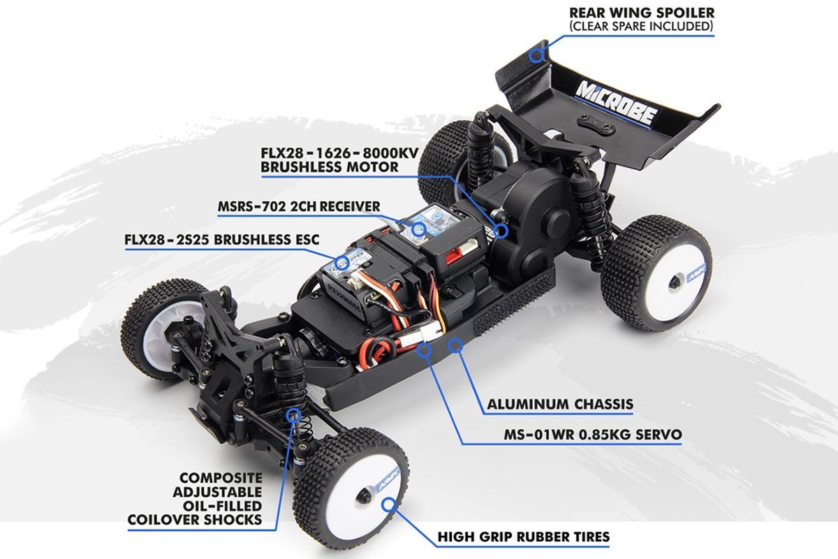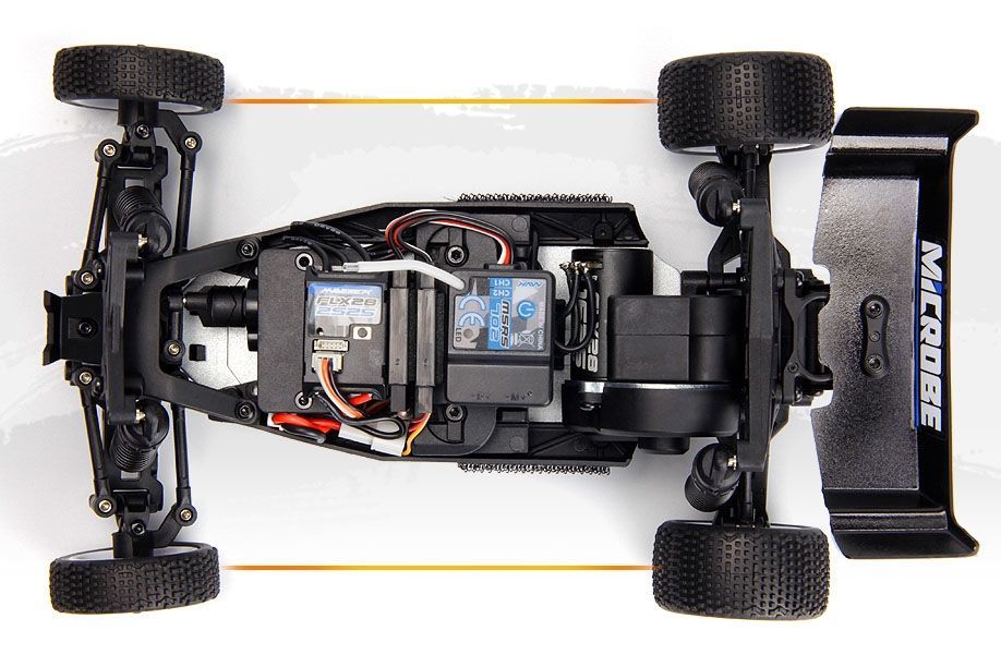 Elegantní plato podvozku z eloxovaného hliníku o tloušťce 1,5 mm, pohonná soustava s kuličkovými ložisky a plynulá zadní převodovka společně dodávají modelu Microbe stabilní a přesný pocit z jízdy. Přidejte k tomu olejové tlumiče a odvětrávaná kola s pěnovými vložkami a máte malou buggy, která miluje řezání zatáček, pohlcování nerovností a nekonečnou akceleraci.
