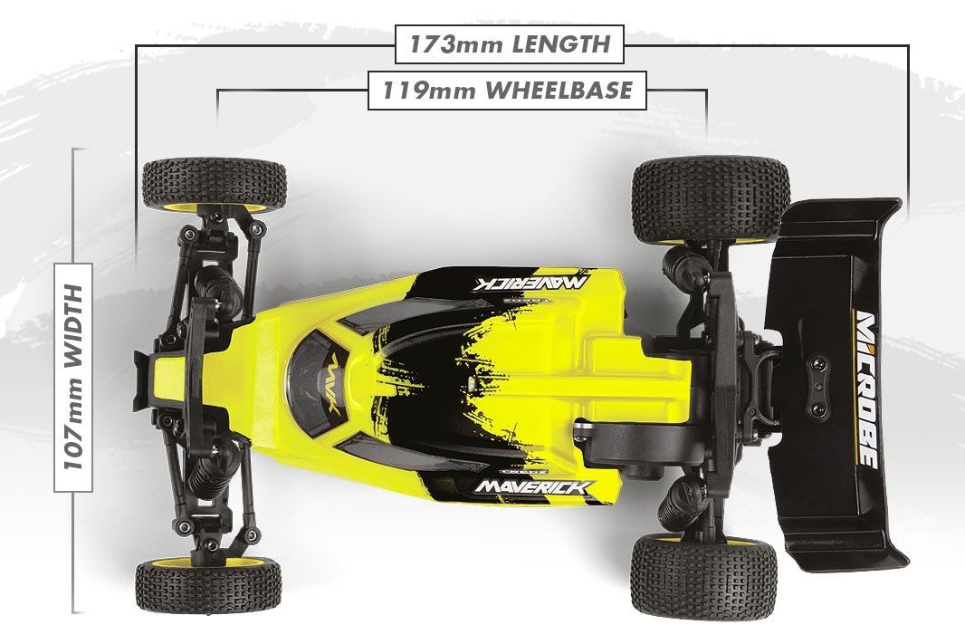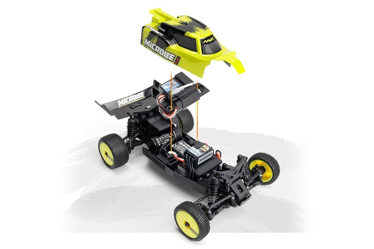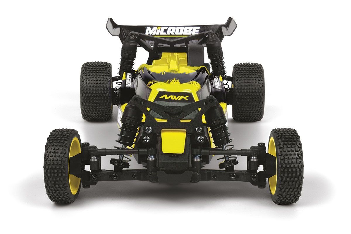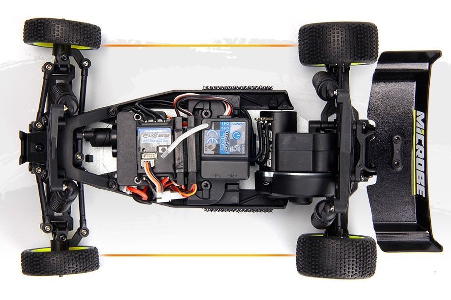 Elegantní plato podvozku z eloxovaného hliníku o tloušťce 1,5 mm, pohonná soustava s kuličkovými ložisky a plynulá zadní převodovka společně dodávají modelu Microbe stabilní a přesný pocit z jízdy. Přidejte k tomu olejové tlumiče a odvětrávaná kola s pěnovými vložkami a máte malou buggy, která miluje řezání zatáček, pohlcování nerovností a nekonečnou akceleraci.
