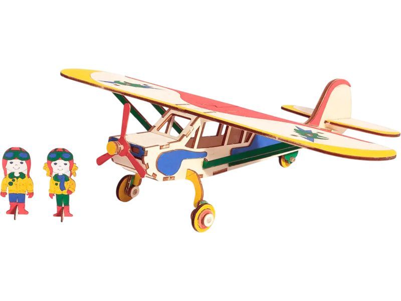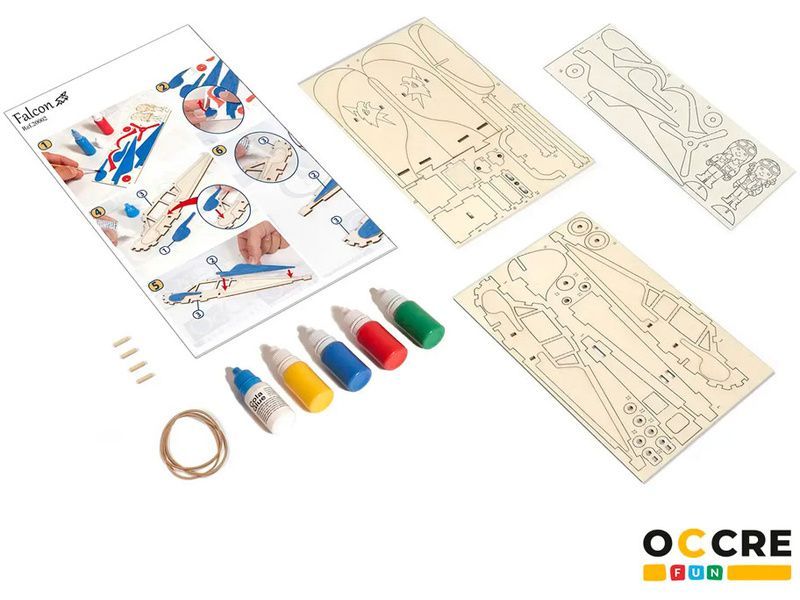 Balení obsahuje: předřezané dřevěné díly, akrylové barvy a štětec, gumičky pro sestavení, bílé lepidlo, barevný ilustrovaný návod krok za krokem.