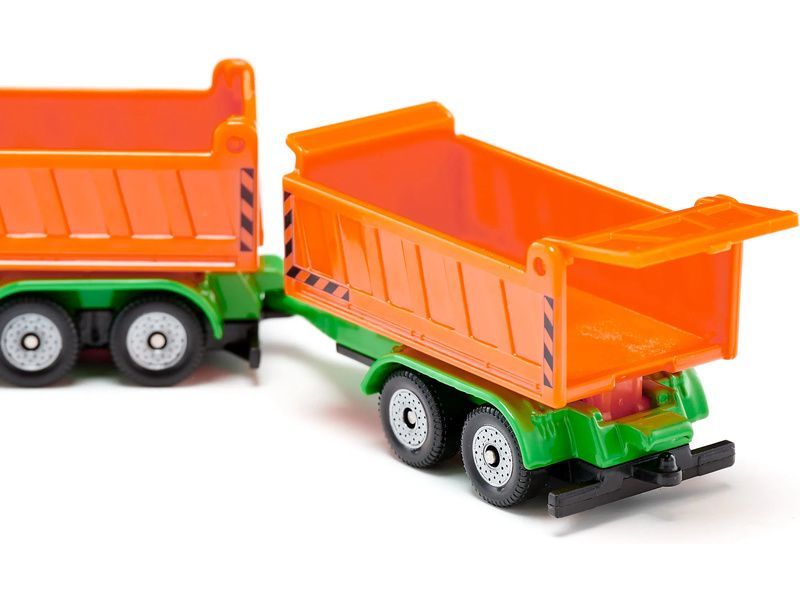 Kovový model nákladního vozu s přívěsem, délka přibližně 15 cm. Model má čirá okna, korba je výklopná s otevíracím čelem stejně jako dvounápravový odpojitelný přívěs. Vhodné pro hraní i sběratelství. Kvalitní zpracování z kovu a plastu. Baleno v blistru.