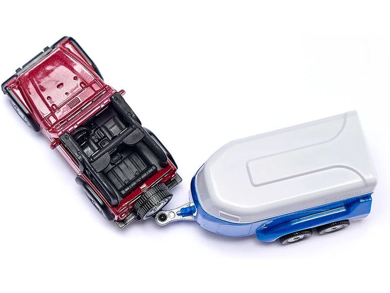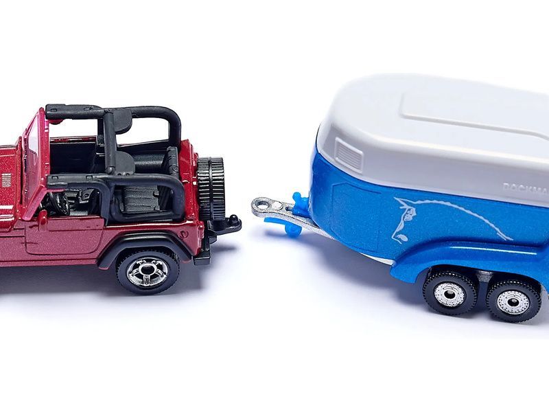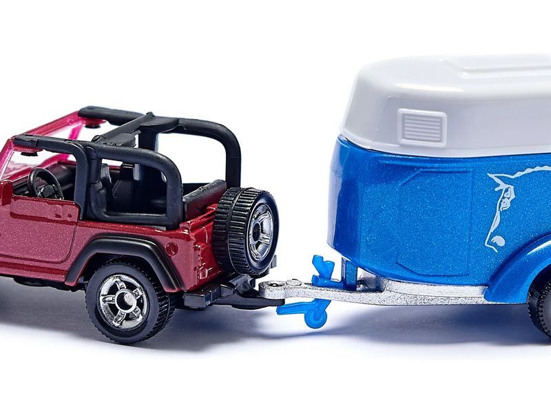 Kovový model terénního vozu Jeep Wrangler s přívěsem a koněm od značky Siku, délka přibližně 15 cm, měřítko 1:55. Model má zpracovaný interiér, dvounápravový krytý přívěs je odpojitelný, má otevírací zadní čelo. Figurka koně je obsahem balení. Vhodné pro hraní i sběratelství. Kvalitní zpracování z kovu a plastu. Baleno v blistru.