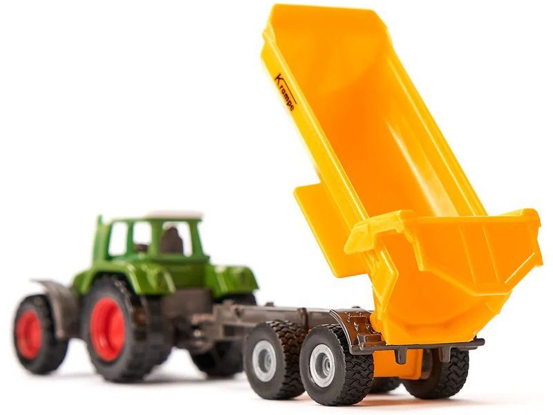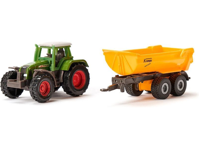 Kovový model traktoru Fendt s přívěsem Krampe, délka přibližně 16 cm. Traktor je vybaven tažným zařízením a odnímatelnou střechou. Dvounápravový přívěs je odpojitelný, má vyklápěcí krobu a otevírací zadní čelo. Vhodné pro hraní i sběratelství. Kvalitní zpracování z kovu a plastu. Baleno v blistru.