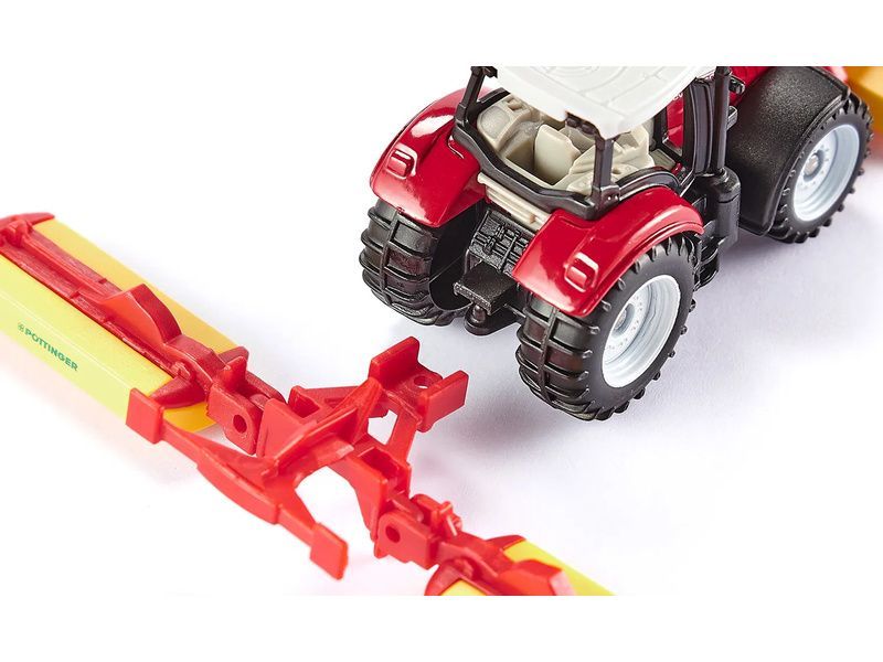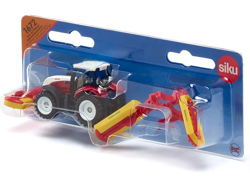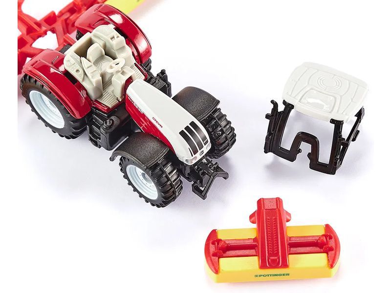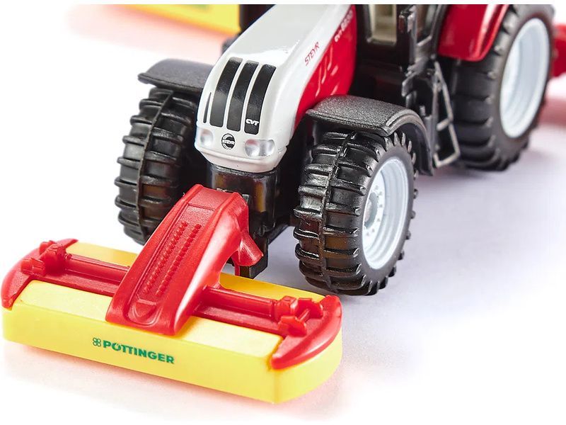 Kovový model traktoru Steyr s žacími lištami Pöttinger, délka přibližně 11 cm. Traktor je vybaven tažným zařízením, odnímatelnou střechou, přední a zadní odnímatelnou žací lištou. Zadní ramena jsou sklopná pro jízdu po silnici, jako u skutečného traktoru. Vhodné pro hraní i sběratelství. Kvalitní zpracování z kovu a plastu. Baleno v blistru.