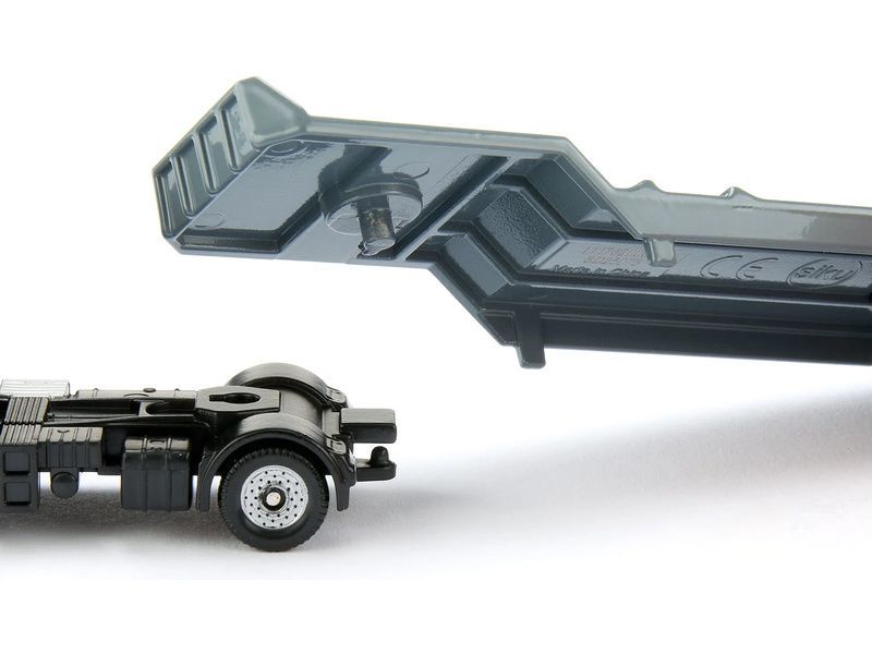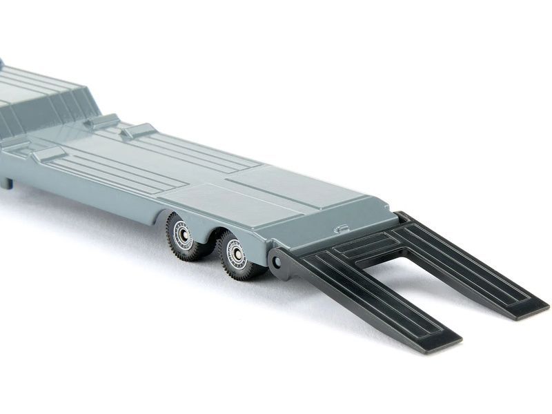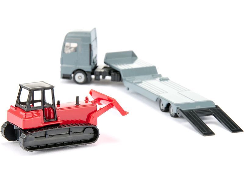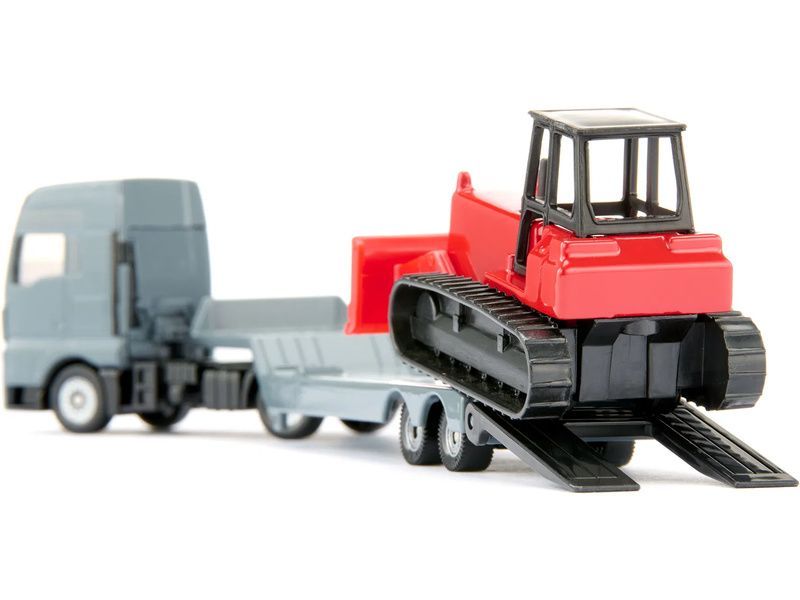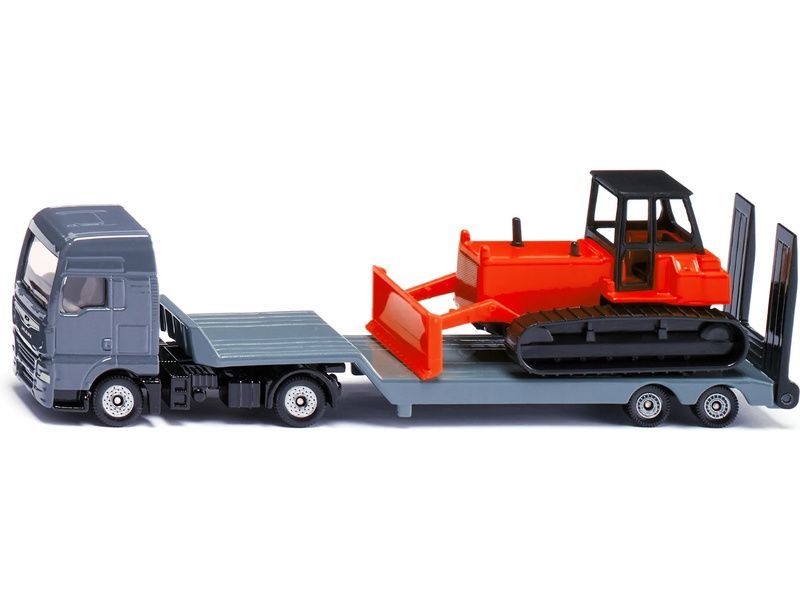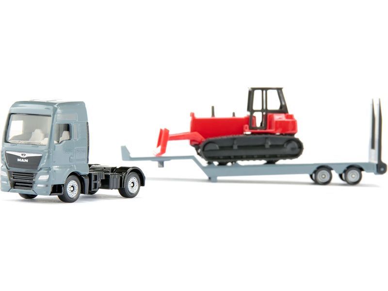 Kovový model tahače MAN s návěsem a buldozerem v měřítku 1:87 od značky Siku. Tahač s čirými okny a zpracovaným interiérem, včetně odpojitelného dvounápravového návěsu se sklopnými nájezdy. Model buldozeru má pohyblivou přední radlici. Vhodné pro hraní i sběratelství. Kvalitní zpracování z kovu a plastu.