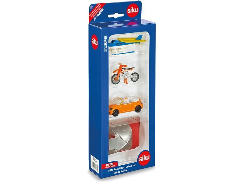 Sada kovový modelů vozidel a příslušenství pro volný čas od značky Siku. Sada obsahuje auto VW New Beetle se zpracovaným interiérem, letadlo s otočnou vrtulí a sklopnými křídly, krosovou motorku a stan. Vhodné pro hraní i sběratelství. Kvalitní zpracování z kovu a plastu.
