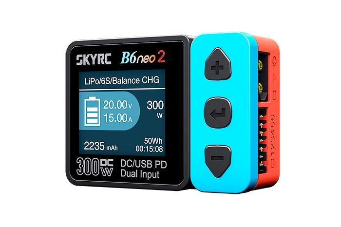 Miniaturní nabíječ SKY RC B6neo2 300W byl konstruován se snahou poskytnout vše potřebné pro nabíjení velkými proudy, s jednoduchou obsluhou, při velikosti na půl dlaně nebo do kapsičky u vesty. B6neo2 umožňuje nabíjet a vybíjet běžné typy článků (NiCd, NiMH, Li-poly, Li-ion, Li-Fe, Li-HV, Pb), navíc je vybaven vestavěným šestikanálovým balancerem, který zajišťuje velmi bezpečné a komfortní nabíjení lithiových akumulátorů. Může také pracovat v režimu regulovaného napájecího zdroje s výstupním napětím nastavitelným v rozmezí 5-27 V a proudem 1-15 A.