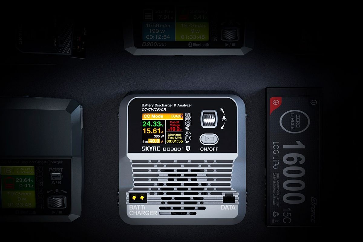 BD380+ je výkonný vybíječ (externí zátěž pro kompatibilní nabíječe SkyRC), který umožňuje vybíjet akumulátory proudem až 40 A (při max. výkonu 380 W), a měřit a porovnávat výkonnost akumulátorů. BD380+ umožňuje ve spolupráci s kompatibilním nabíječem SkyRC a PC programem Charge Master nebo mobilní aplikací přesné měření užitečné kapacity akumulátorů za plně kontrolovatelných a opakovatelných podmínek při výběru nejlepšího akumulátoru pro vaši aplikaci už nebudete jen hádat, ale budete znát tvrdá čísla.