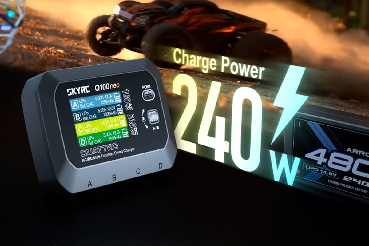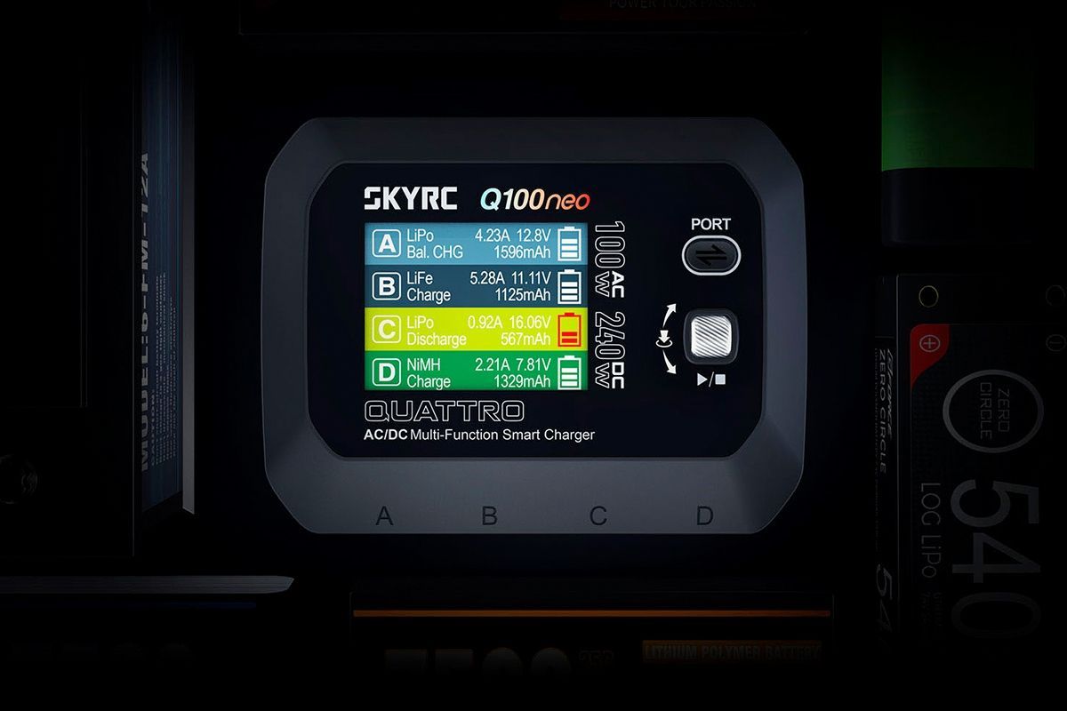 Čtyřkanálový nabíječ SKY RC Q100neo 240W byl konstruován se snahou poskytnout vše potřebné pro nabíjení čtyř akumulátorů - spíše menší kapacity - současně pod jednou střechou" včetně síťového zdroje, s jednoduchou obsluhou. Q100neo umožňuje nabíjet a vybíjet běžné typy článků (NiCd, NiMH, Li-poly, Li-ion, Li-Fe, Li-HV, Pb), navíc jsou všechny kanály vybaveny vestavěnými čtyřkanálovými balancery, které zajišťují velmi bezpečné a komfortní nabíjení lithiových akumulátorů.