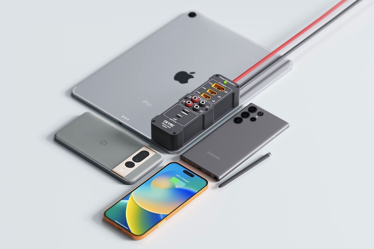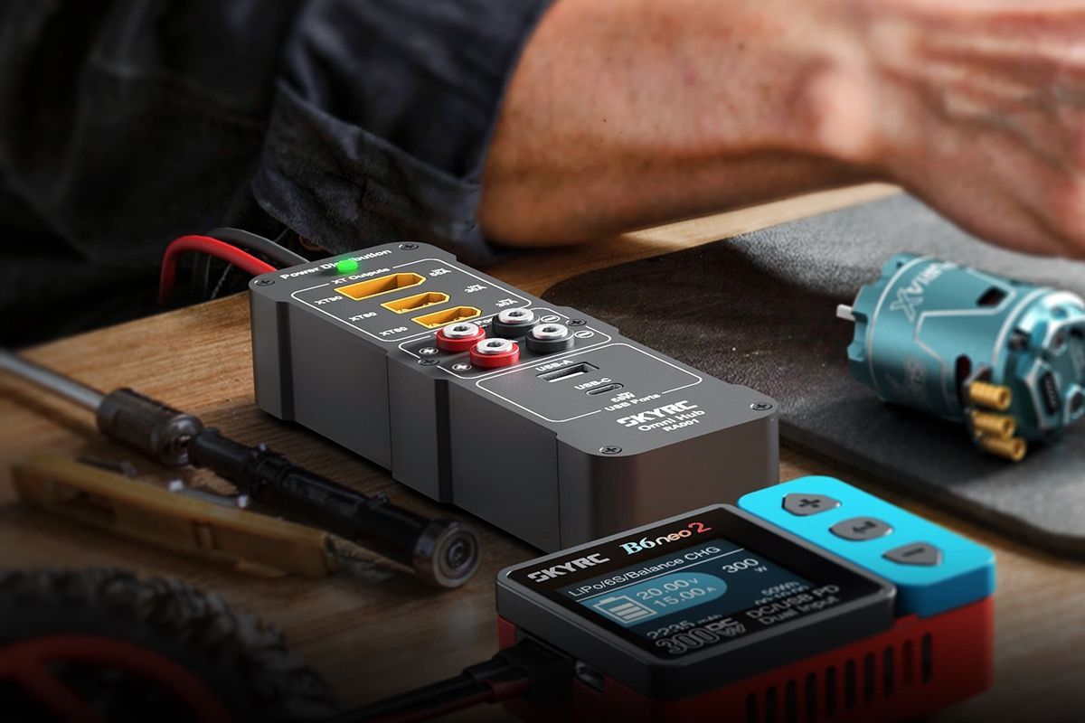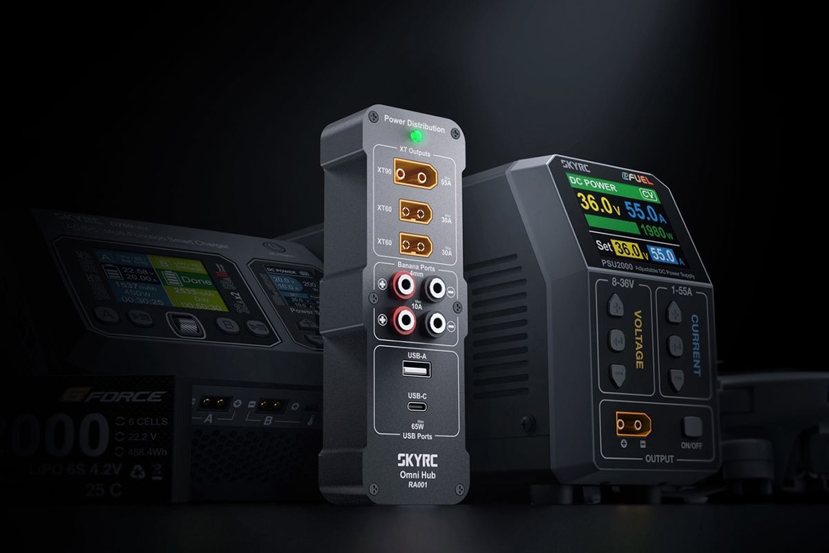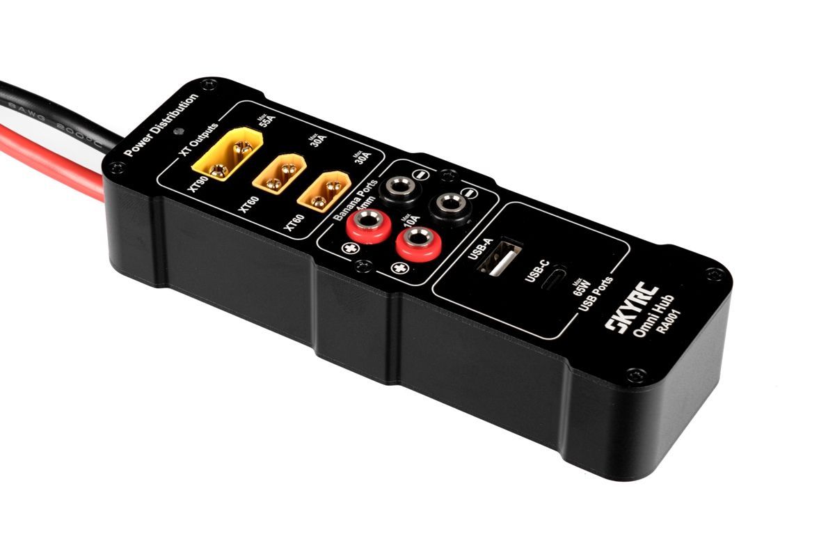 Napájecí a nabíjecí ústředna RA 001 Omni Hub umožňuje po připojení ke kompatibilnímu stabilizovanému síťovému zdroji současně napájet několik RC a digitálních mobilních zařízení s celkovým výstupním výkonem až 2000 W. Zásuvky 1x XT90, 2x XT60, 2x 4mm banánky, nabíjecí výstupy USB-A a USB-C PD3.0. Doplňkové příslušenství pro síťové zdroje SkyRC PSU2000.