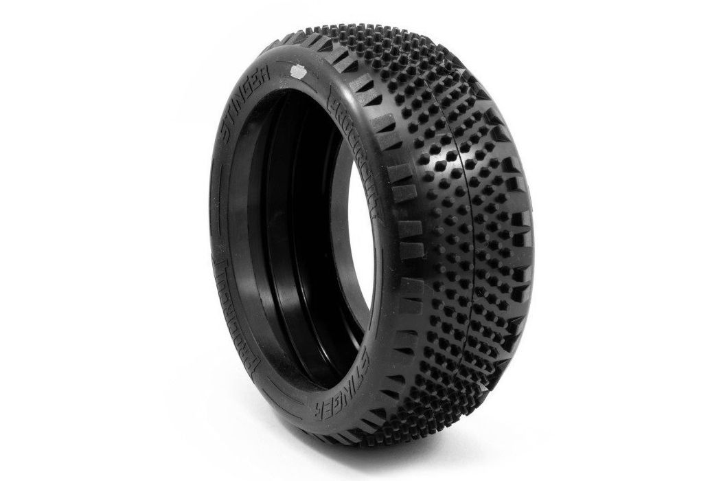 Pneumatika Stinger je speciálně navržena pro astroturfové a kobercové dráhy s vysokou přilnavostí. Je vybavena centrálním vzorkem dlouhých pinů v kombinaci s úhlovými bočními bloky, které zajišťují přímou trakci vpřed a zároveň snižují nadměrný boční záběr při vysokých rychlostech. Výsledkem je čistější a kontrolovanější zatáčení, ideální pro přední nápravu nebo setupy, které upřednostňují snadné a předvídatelné ovládání.