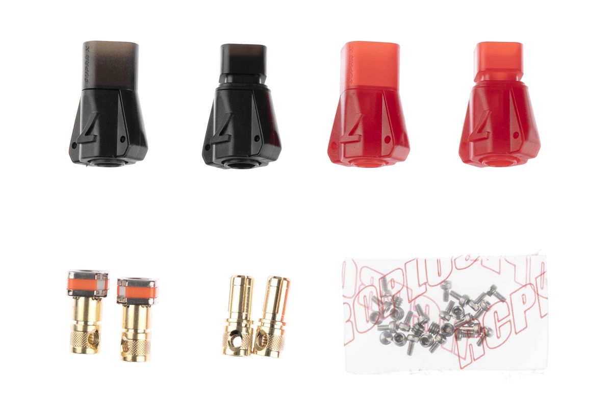 Zlacené 7mm Anti-spark konektory s domkem pro 8,4mm2 (8AWG) kabel. Konstantní proud 280A, špičkový 320A. Max 60V DC. Nepájecí varianta - kabel je zajištěn pomocí dvou imbusových červíků. Balení 2 páry (2x anti-spark samice + 2x samec). Kompatibilní s S7 7808 ULTRA (REB7808ULTS7P6 a REB7808ULTS7P2). Objednací kód výrobce REB7808 ASST S7 P2.