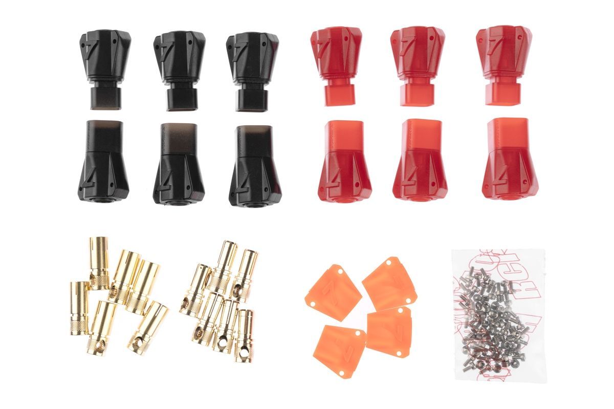 Zlacené 7mm konektory s domkem pro 8,4mm2 (8AWG) kabel. Konstantní proud 280A, špičkový 320A. Max 60V DC. Nepájecí varianta - kabel je zajištěn pomocí dvou imbusových červíků. Balení 6 párů. Kompatibilní s Anti-spark S6 7808 ASST (REB7808ASSTS7P2). Objednací kód výrobce REB7808 ULTRA S7 P6.