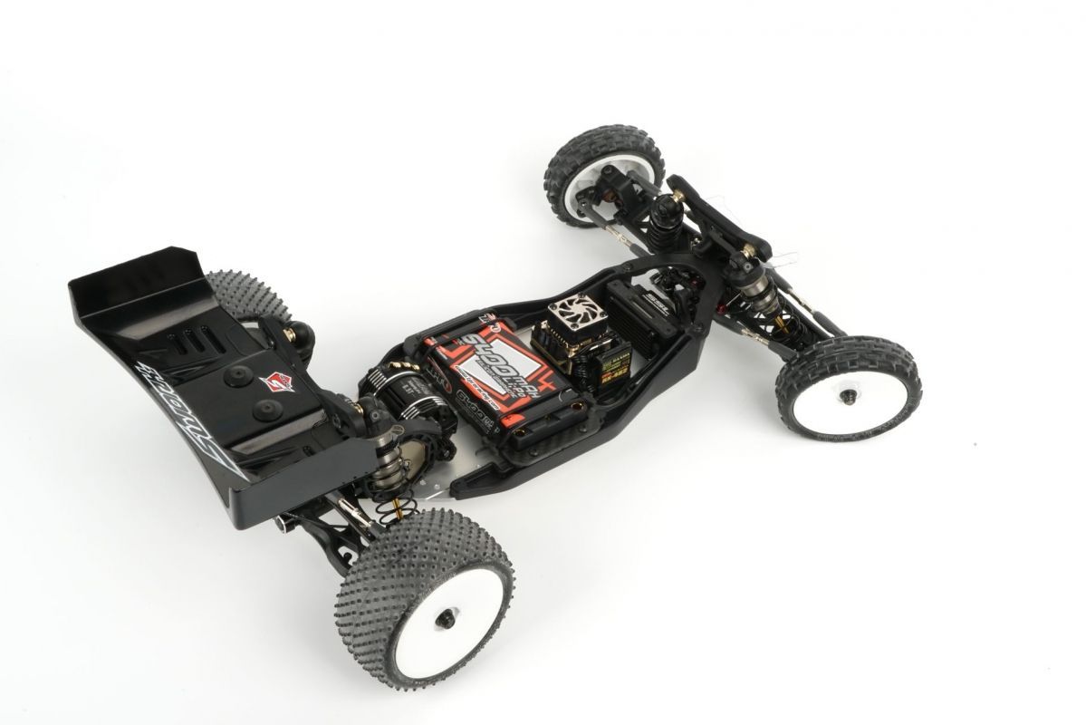 Buggy je vybavena nově navrženým 13mm systémem tlumičů BBS Big Bore Shock System od SWORKz, který je obsahuje přesná emulzní plastová víčka a zesílené pístky tlumičů pro lepší odolnost. Osy tlumičů potažené teflonem zajišťují ultra hladkou odezvu tlumení, zatímco 4mm karbonové věže tlumičů poskytují výjimečnou pevnost. Sada také obsahuje ochranné kryty věží tlumičů a nejnovější 13mm pružiny BBS Black Line s miskami pružin se zámky proti otočení pro konzistentní výkon a výrazné zlepšení ovladatelnosti při skocích.