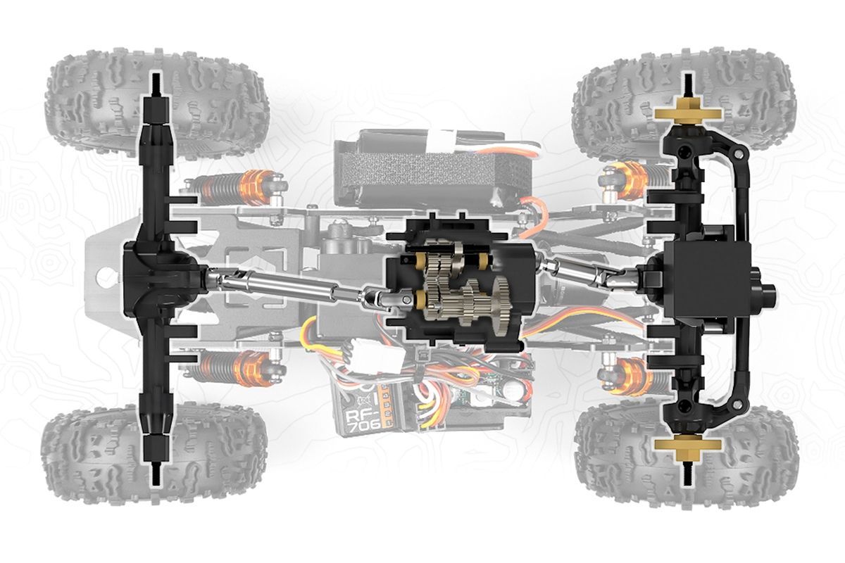 Pevný 2mm hliníkový podvozek, centrální servem ovládaná převodovka half-DIG, vyhlazená spodní strana, přední převodovka s overdrive a přidané nízko namontované mosazné komponenty společně poskytují působivou ovladatelnost a trakci v kompaktním balení.