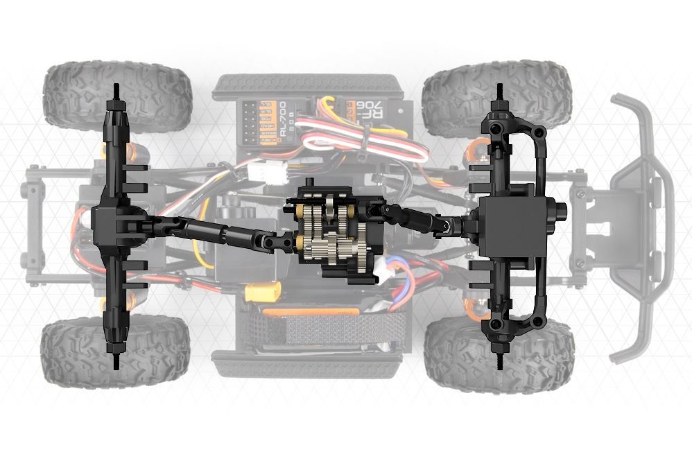 Nízký převod se může pochlubit působivým převodovým poměrem 81,44:1, který poskytuje výjimečné schopnosti při pomalém průchodu na úzkých, technických stezkách a překážkách. A když na rovném, otevřeném úseku potřebujete přidat na rychlosti - nebo prostě jen potřebujete vysoký výkon, abyste se dostali do stoupání - stačí na vysílači přeřadit na vysoký převod, čímž získáte převodový poměr 20,36:1, který vám nabídne pořádnou rychlost.